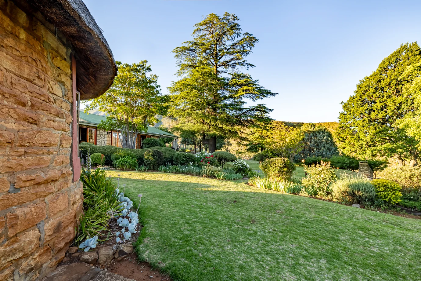 - Indoor and outdoor dining with views of the gardens, Makhaleng Valley, and Maluti Mountains.