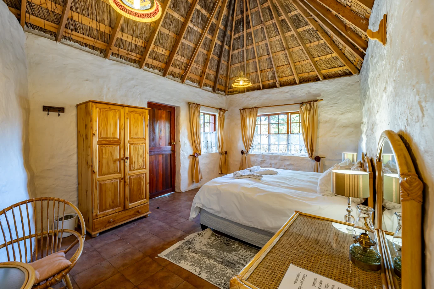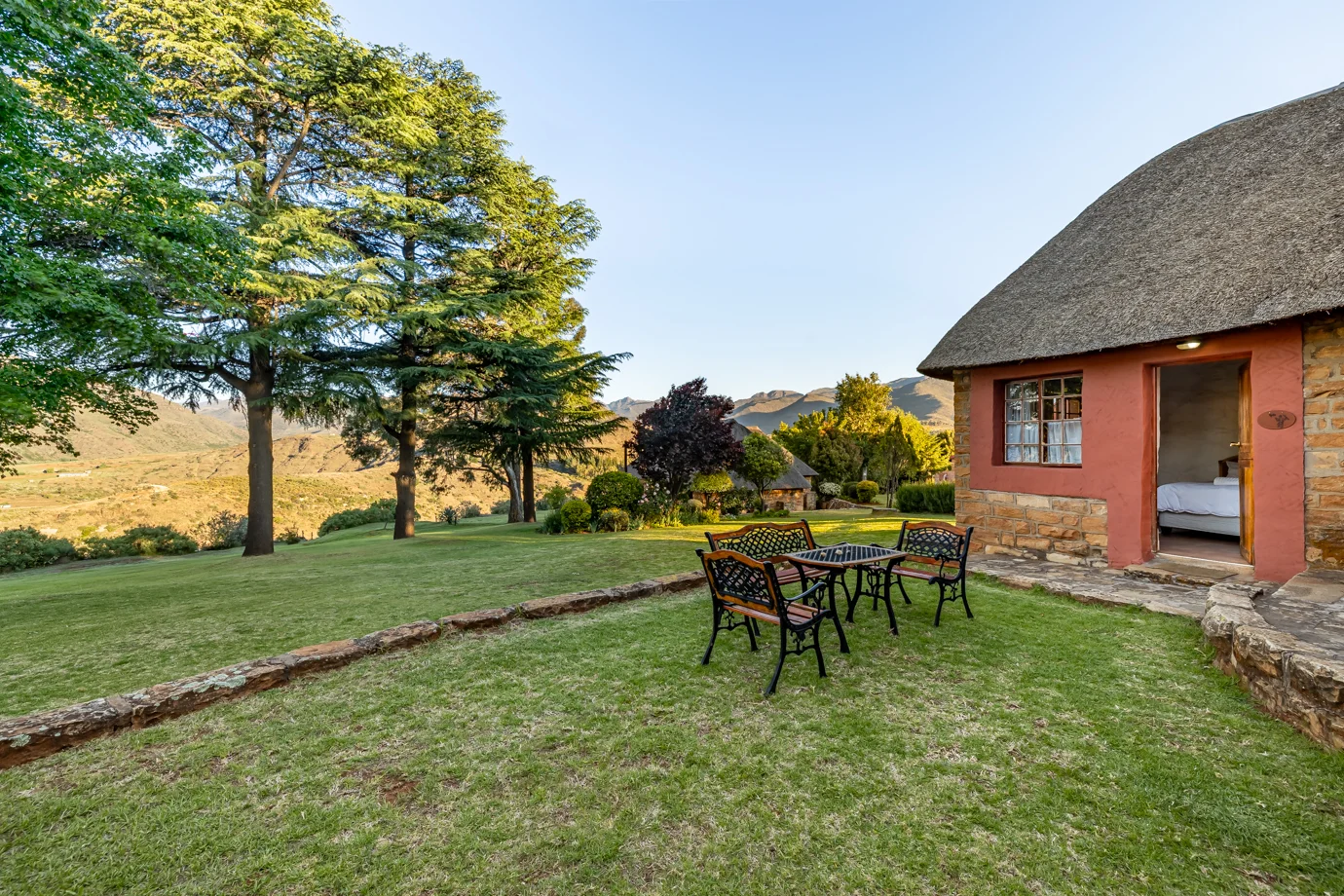 All three rondavels overlook the garden and surrounding mountains, with natural light, fresh air, and a calm setting that reflects the character of Ramabanta Trading Post.